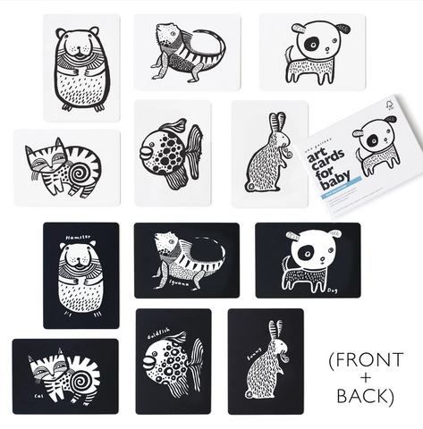 Babies are fascinated with black and white designs. Right from the start, our cards begin to aid in a baby's cognitive and visual perception because, with developing vision, they are able to see the high contrast pictures. Babies love our Art Cards — from day one they can grab the attention of a newborn. These cards grow with your child as the shapes come together to form patterns, whole images, inspire tummy time activities, and later become flash cards of their animal pals.