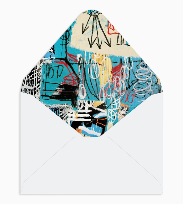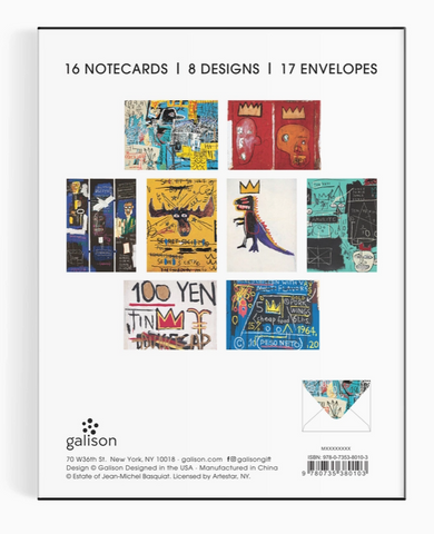 The Basquiat Greeting Card Assortment features 8 iconic Basquiat works. The images include a mix of jazz and pop culture references, in addition to his baroque use of text and key iconography.