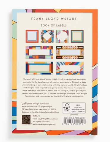 This Frank Lloyd Wright Book of Labels is perfect for all of your labeling needs! From gifting to organizing to art projects, two different sizes of a total of eight different labels are here to help! Inspired by the artist Frank Lloyd Wright and his stunning geometric designs.