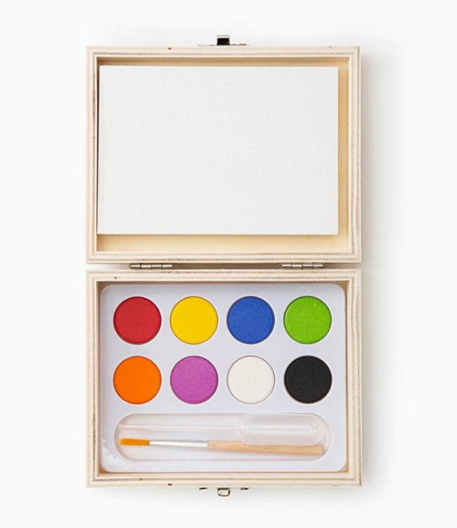 For on-the-go creativity! A mini watercolor kit that comes with a brush, water pipette, 8 different watercolor paints, and 4.1 in. x 2.9 in. watercolor paper pad.