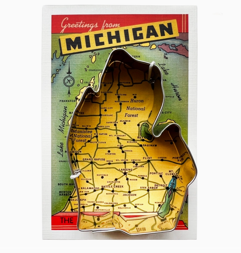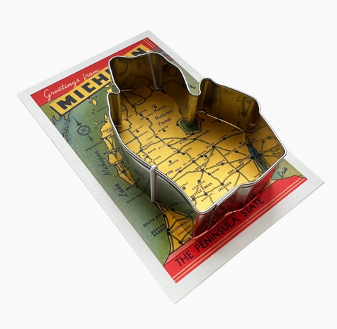 Bake up some Michigan pride with these fun cookie cutters. The cookie cutters are food-safe and dishwasher-safe. Made from high-quality stainless steel, they are 100% made in Michigan and come packaged on retro postcards.