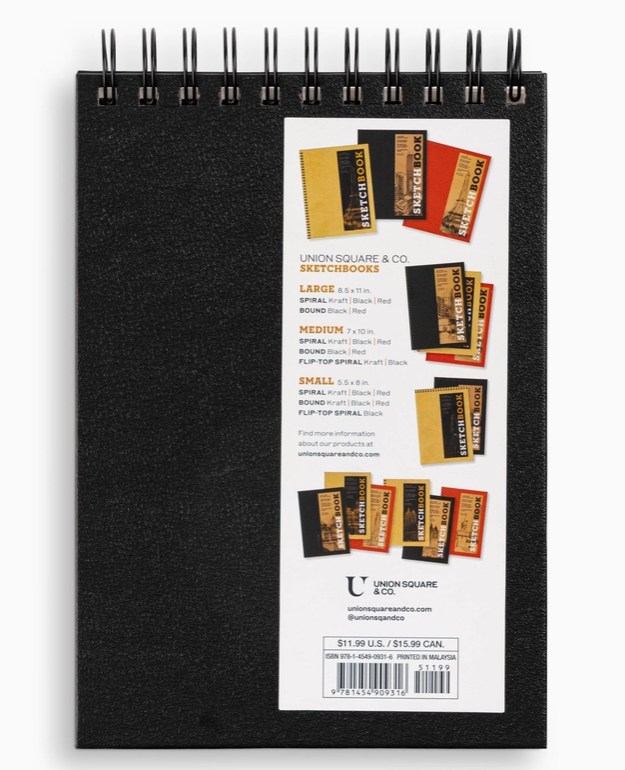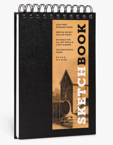 This sketchbook contains acid-free, medium-weight drawing paper that is compatible from charcoal and pencil to light washes with ink and watercolor. Perforated pages make it easy to tear out "masterpieces" for framing or gift giving. All the copy (title, paper description, size, page count) appears on an attractively designed removable sticker that you can either leave on or remove for a clean, blank front cover. Paper is acid free and FSC Certified. The paperweight is 135GSM, which equates to a 90lb stock (medium weight) and has a vellum finish. Hardcover Book with Spiral; 5 1/2 x 8 inches; 128 pages.