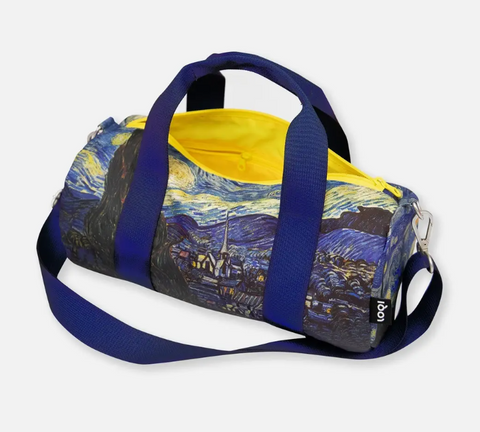 Swirling night sky and vibrant stars contrast with the peaceful village below. The Starry Night (1889) on the recycled weekender symbolizes Vincent van Gogh’s tension between inner chaos and external calm. The painting captures van Gogh’s longing for peace and connection with the universe. © MoMA New York.