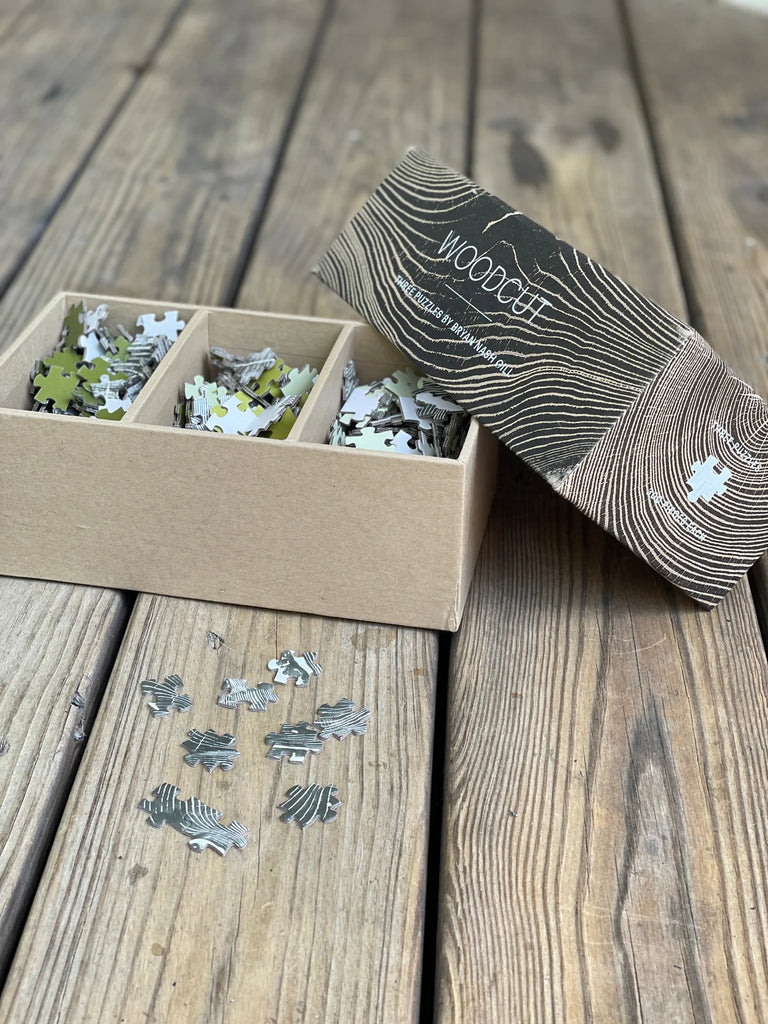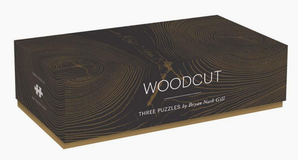Escape to a world of arboreal beauty with this three-in-one puzzle box set featuring the majestic woodcut prints of artist Bryan Nash Gill. Each piece of art in this unique three puzzle set captures the great beauty and power of trees in exquisite detail. The 300-piece puzzles are stored in individual sections in the box, to be completed separately, or mix all the pieces together for an extra challenge. Each puzzle has a different color on the bottom of its pieces for simple sorting and reboxing. The elevated minimalist box makes a stunning addition to any shelf or coffee table between puzzlings. Woodcut: Three Puzzles is the latest addition to our bestselling Woodcut series.